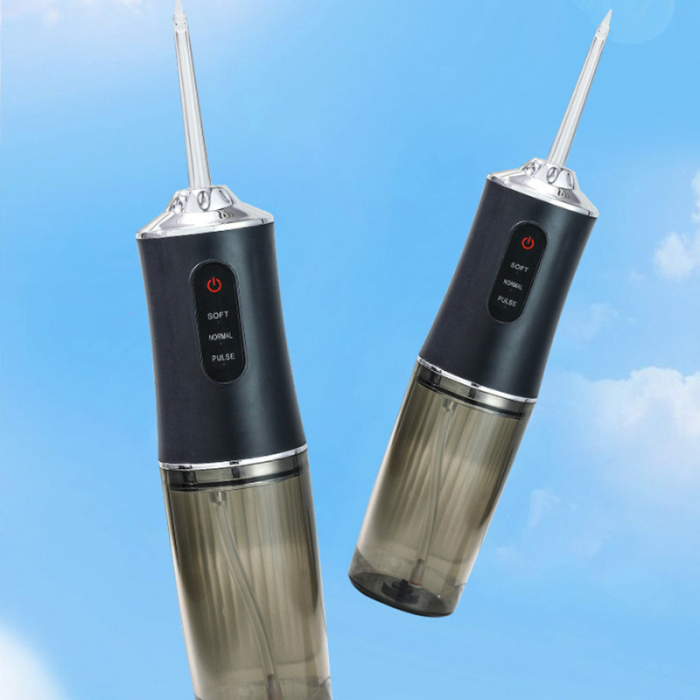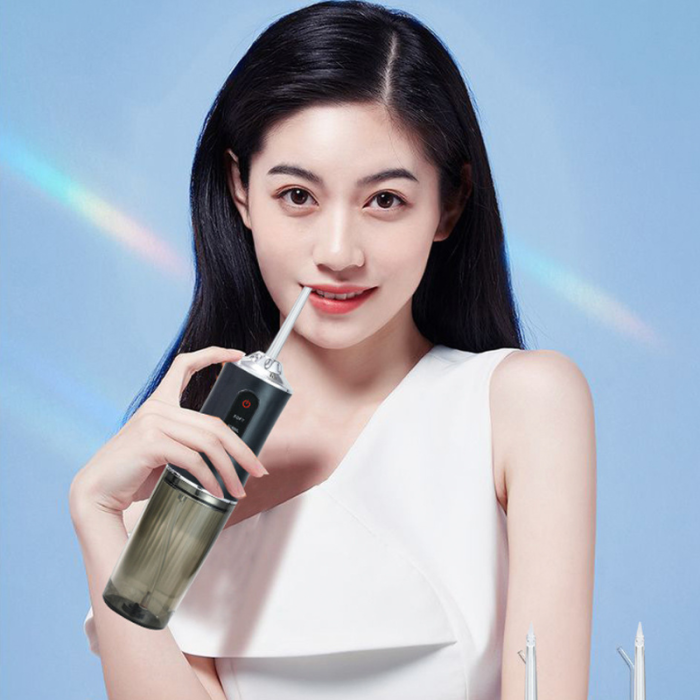 Equipped with a water flosser designed to rinse between teeth and gum margins with a high-pressure stream of water, similar to the cleaning effect of traditional flossing.